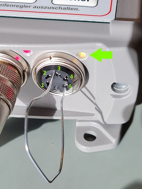 Scheint alles soweit okay, aber der Fehler bleibt bestehen, ziehen Sie den 4. ganz rechten 5-poligen Stecker aus dem Bedienteil. Brücken Sie mit Hilfe einer aufgebogenen Büroklammer in dem Stecker Pin 3 mit Pin 5, wie im nachfolgenden Bild zu sehen. Schaltet in der Steuerung hörbar ein Relais, der Alarm verschwindet und die rote LED wird leuchte nun gelb, ist entweder das Kabel oder der wieder angeschlossene Temperaturschalter defekt.