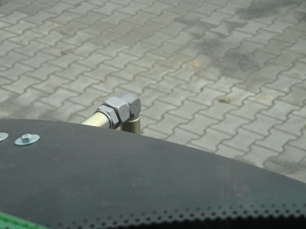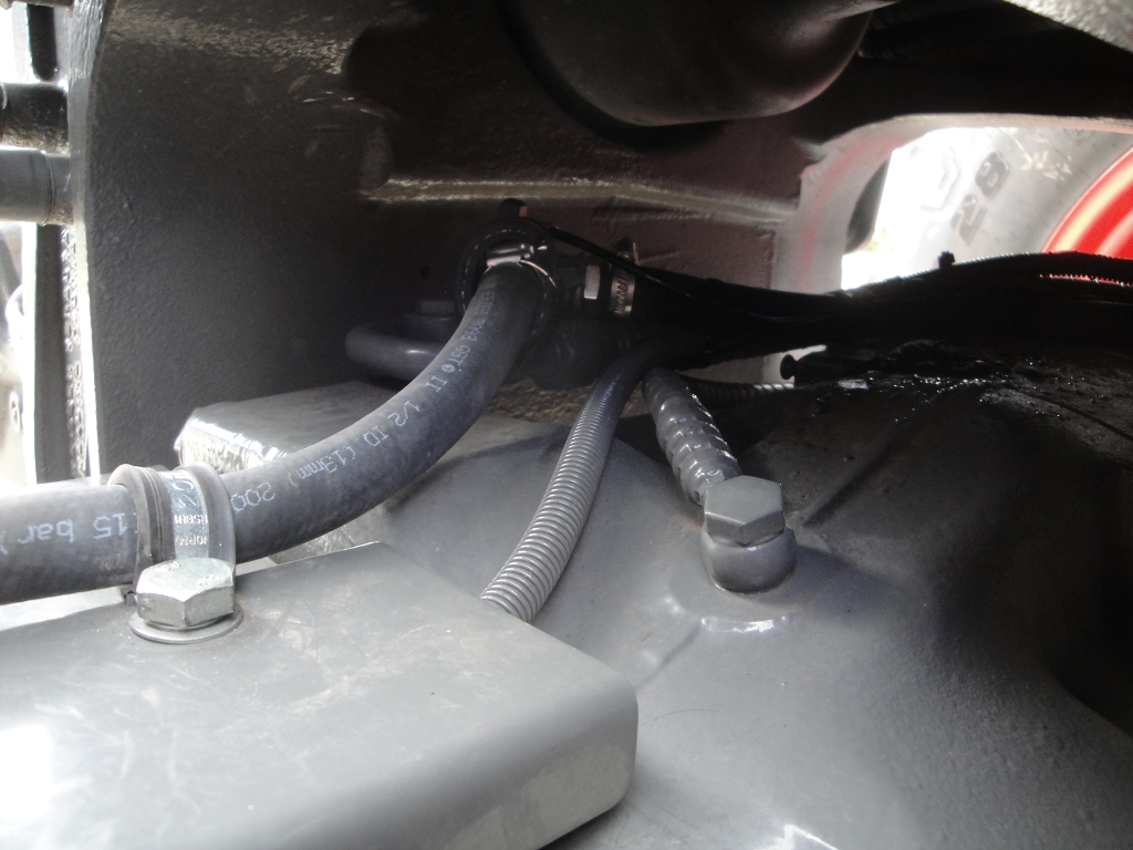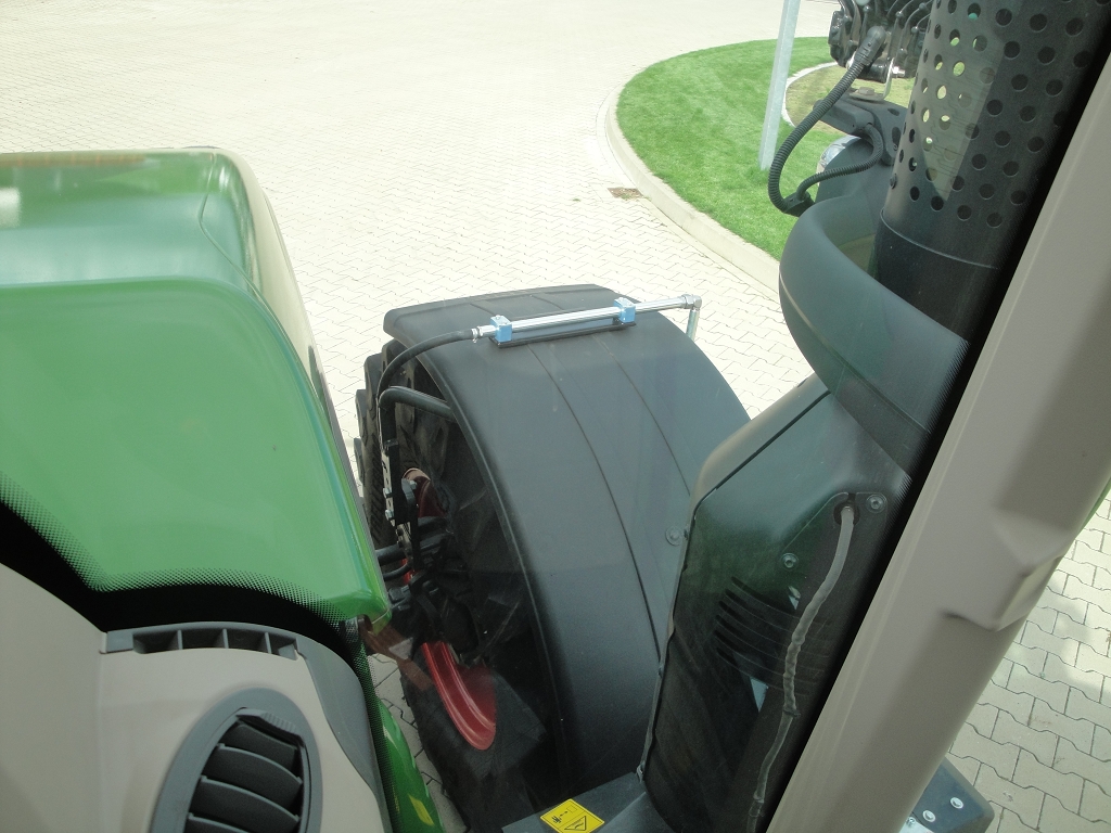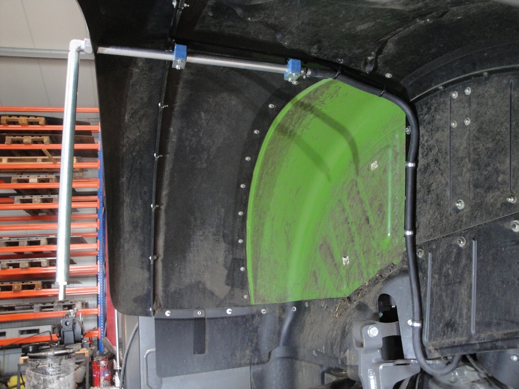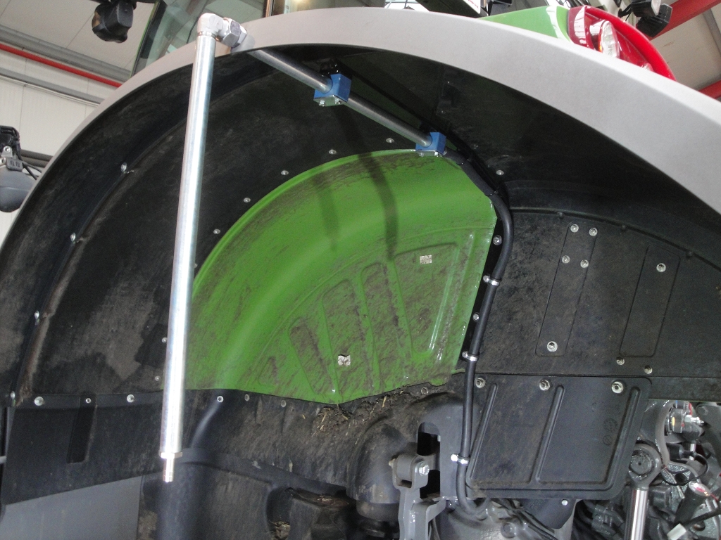 Bild 31: Fendt 724 Bj. 2020 mit Radgewicht und Reifenregler, Schlauchverlegung, Rohrbügel an Hinterachse wird durch Bohrung in Kotflügelverbreitung geführt