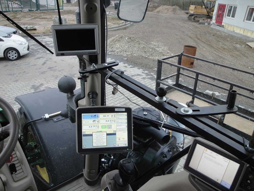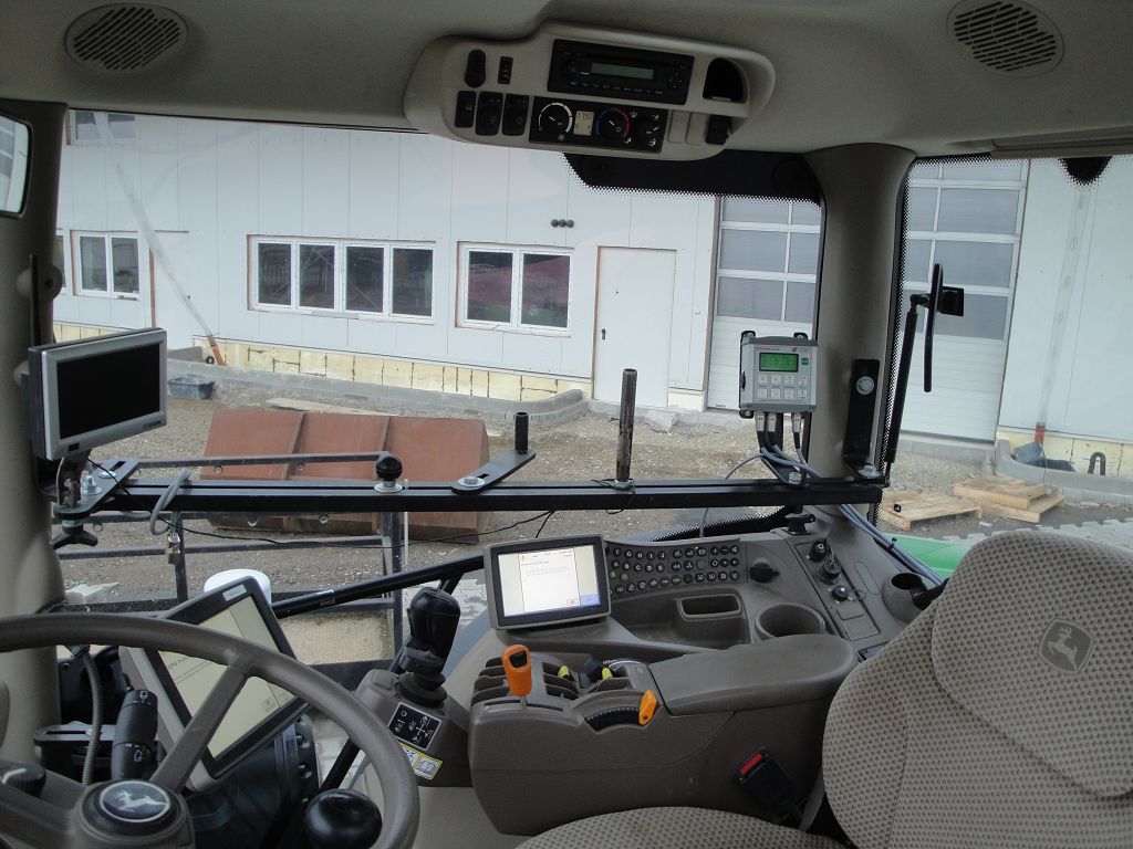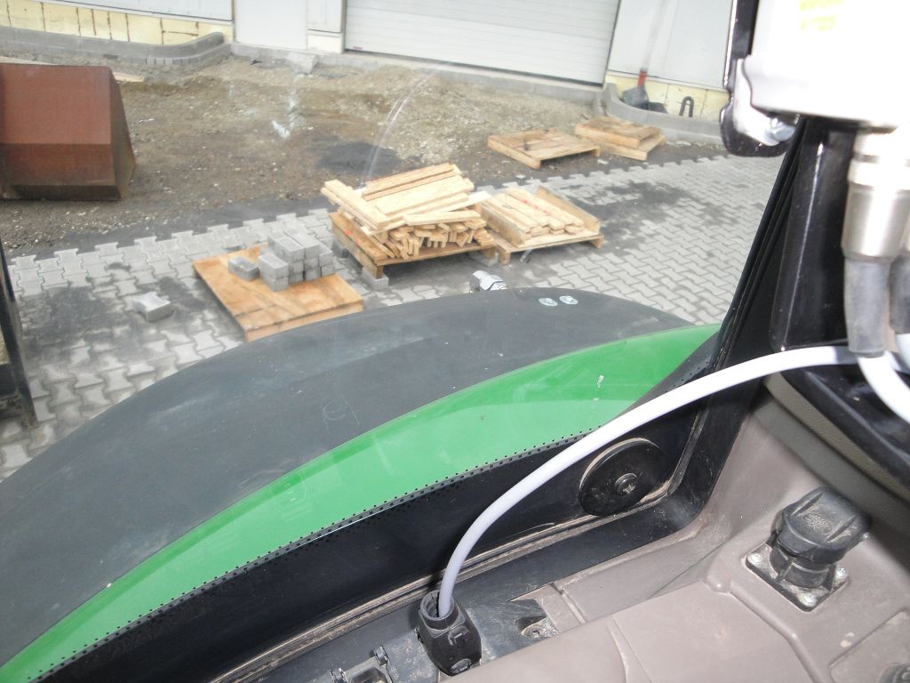 Bild 28: JD 6210R Bj. 2017 mit Steckachsen, Reifenregler, Zusatzkompressor rechts auf dem Aufstieg aus der Fahrerperspektive