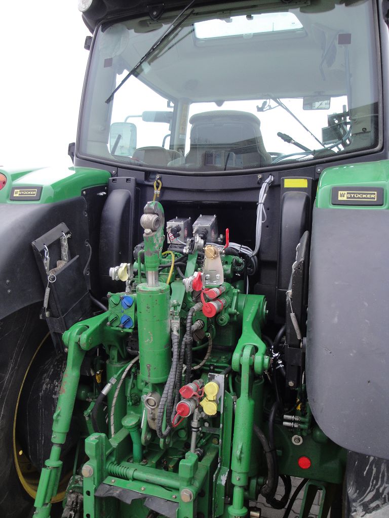 Bild 12: JD 6210R Bj. 2017 mit Steckachsen, Reifenregler, Rohrbügel hinten rechts aus der Fahrerpespektive