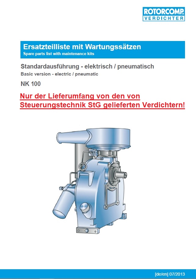 Ersatzteilliste und Explosionszeichnung vom Rotorcomp NK 100 Schraubenverdichter. Nur der Lieferumfang von den von Steuerungstechnik StG gelieferten Verdichtern!